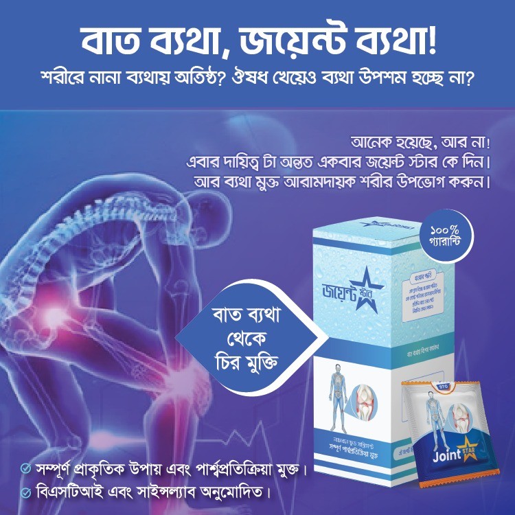 ✅ শারীরিক, স্নায়ু, মাংসপেশী, হাঁড় এবং অস্থিমজ্জার পুষ্টি ঘাটতি জনিত ব্যাথা সমূহ থেকে নিজেকে মুক্ত রাখার জন্য এবং স্টেম সেলকে গভীর থেকে পরিপুষ্ট রাখতে, দেহের হরমোনের কারণে সৃষ্ট বিভিন্ন জটিলতা থেকে যে ব্যথা সৃষ্টি হয় তা দূর করতে সেবন করুন জয়েন্ট স্টার। এটি প্রাকৃতিক ব্যাথা নাশক ও ব্যাথা প্রতিরোধক হিসেবে দারুন কার্যকারী।