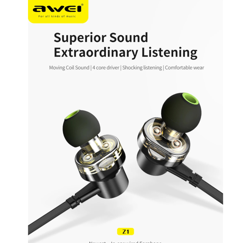 Awei Z1 Dual Drivers Wired In-ear Earphone Deep Bass Stereo with Mic ( Six Month Warrenty)